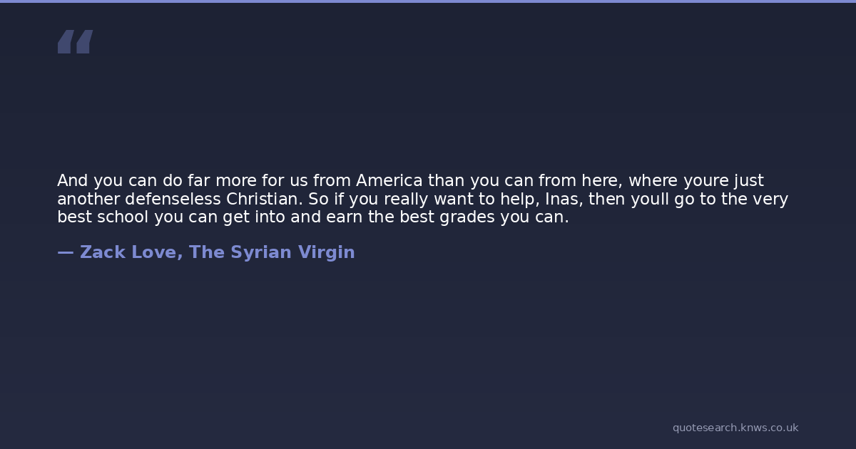 And you can do far more for us from America than you can from here, where youre just another defenseless Christian. So if you really want to help, Inas, then youll go to the very best school you can get into and earn the best grades you can.