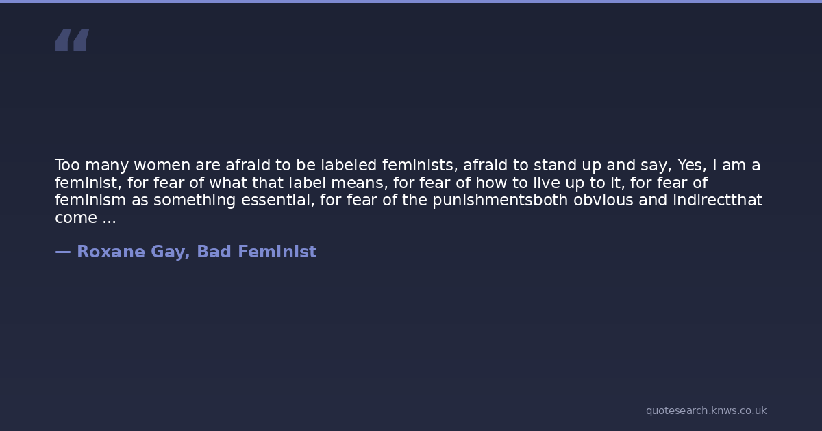 Too many women are afraid to be labeled feminists, afraid to stand up and say, Yes, I am a feminist, for fear of what that label means, for fear of how to live up to it, for fear of feminism as something essential, for fear of the punishmentsboth obvious and indirectthat come with openly owning feminism or doing feminism wrong.