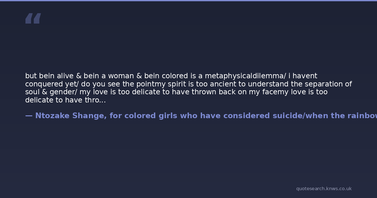 but bein alive & bein a woman & bein colored is a metaphysicaldilemma/ i havent conquered yet/ do you see the pointmy spirit is too ancient to understand the separation of soul & gender/ my love is too delicate to have thrown back on my facemy love is too delicate to have thrown back on my face my love is too beautiful to have thrown back on my face my love is too sanctified to have thrown back on my face my love is too magic to have thrown back on my face my love is too saturday nite to have thrown back on my face my love is too complicated to have thrown back on my face my love is too music to have thrown back on my face