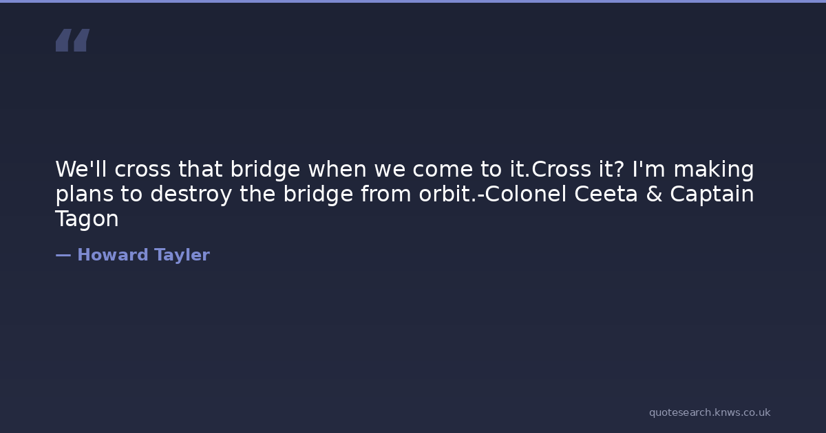 We'll cross that bridge when we come to it.Cross it? I'm making plans to destroy the bridge from orbit.-Colonel Ceeta & Captain Tagon