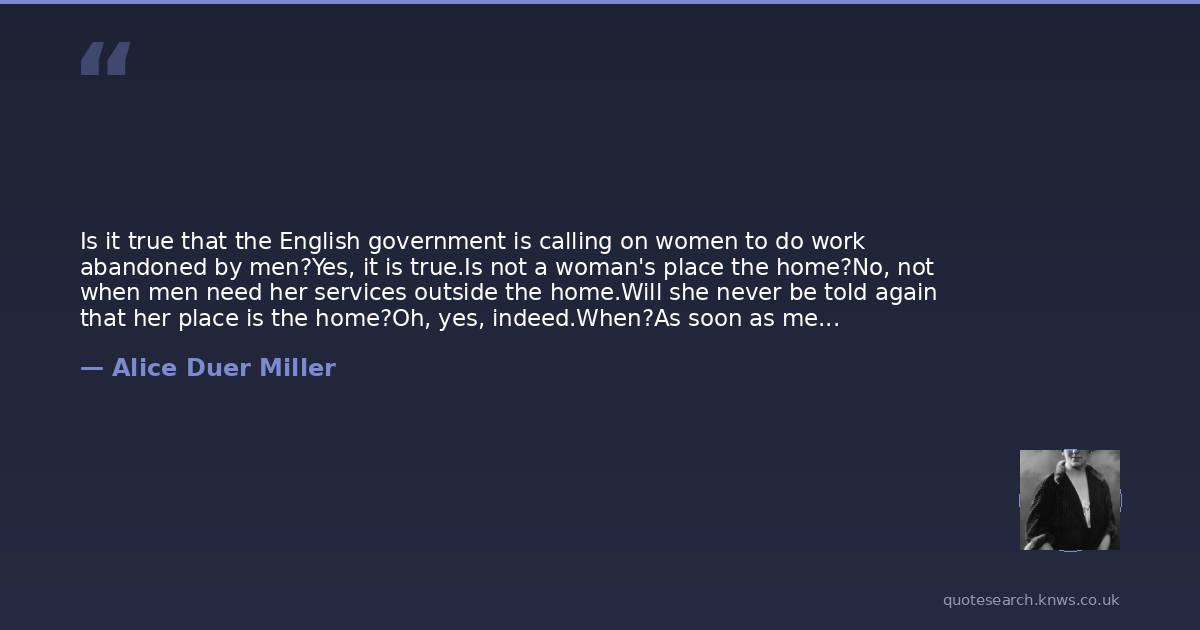 Is it true that the English government is calling on women to do work abandoned by men?Yes, it is true.Is not a woman's place the home?No, not when men need her services outside the home.Will she never be told again that her place is the home?Oh, yes, indeed.When?As soon as men want their jobs back again.