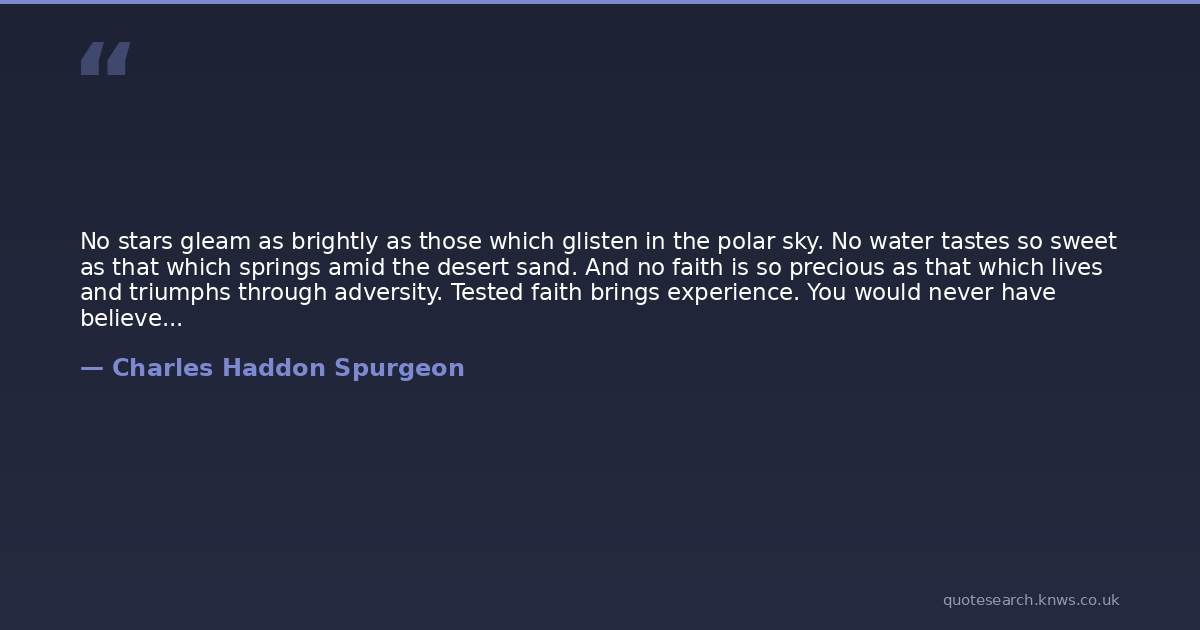 No stars gleam as brightly as those which glisten in the polar sky. No water tastes so sweet as that which springs amid the desert sand. And no faith is so precious as that which lives and triumphs through adversity. Tested faith brings experience. You would never have believed your own weakness had you not needed to pass through trials. And you would never have known Gods strength had His strength not been needed to carry you through.