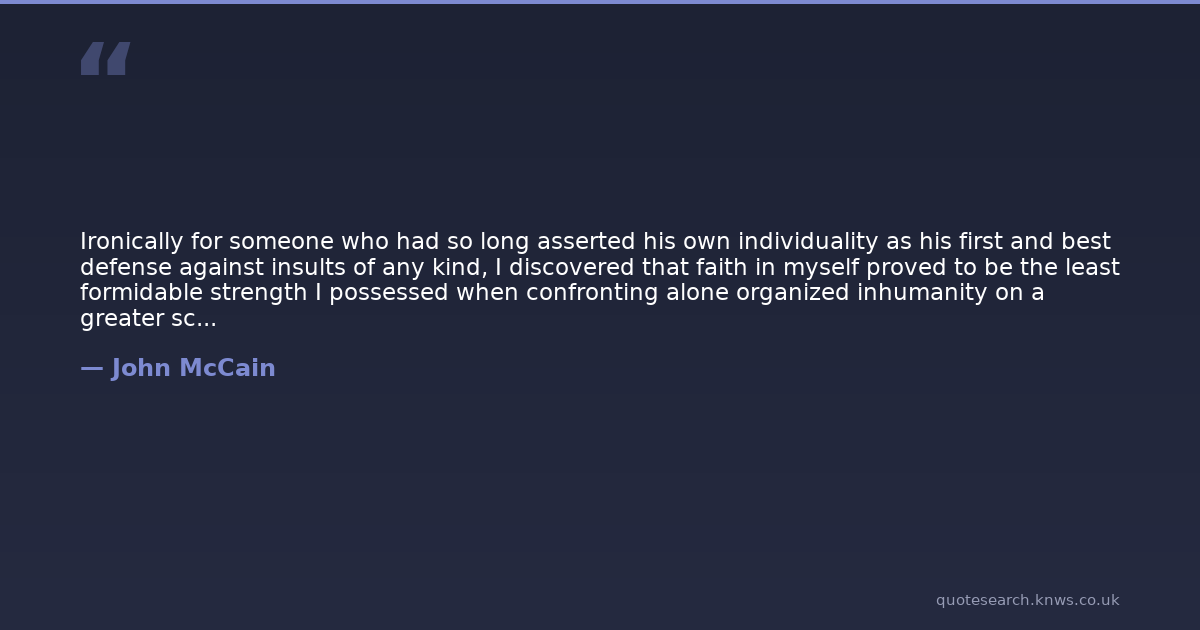 Ironically for someone who had so long asserted his own individuality as his first and best defense against insults of any kind, I discovered that faith in myself proved to be the least formidable strength I possessed when confronting alone organized inhumanity on a greater scale than I had conceived possible. Faith in myself was important, and remains important to my self esteem. But I discovered in prison that faith in myself alone, sep0arate from other, more important allegiances , was ultimately no match for the cruelty that human beings could devise when they were entirely unencumbered by respect for the God given dignity of man. This is the lesson I learned in prison. It is, perhaps, the most important lesson I have ever learned.