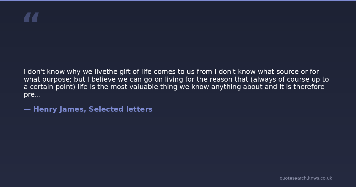 I don't know why we livethe gift of life comes to us from I don't know what source or for what purpose; but I believe we can go on living for the reason that (always of course up to a certain point) life is the most valuable thing we know anything about and it is therefore presumptively a great mistake to surrender it while there is any yet left in the cup. In other words consciousness is an illimitable power, and though at times it may seem to be all consciousness of misery, yet in the way it propagates itself from wave to wave, so that we never cease to feel, though at moments we appear to, try to, pray to, there is something that holds one in one's place, makes it a standpoint in the universe which it is probably good not to forsake. You are right in your consciousness that we are all echoes and reverberations of the same, and you are noble when your interest and pity as to everything that surrounds you, appears to have a sustaining and harmonizing power. Only don't, I beseech you, generalize too much in these sympathies and tendernessesremember that every life is a special problem which is not yours but another's, and content yourself with the terrible algebra of your own. Don't melt too much into the universe, but be as solid and dense and fixed as you can. We all live together, and those of us who love and know, live so most. We help each othereven unconsciously, each in our own effort, we lighten the effort of others, we contribute to the sum of success, make it possible for others to live. Sorrow comes in great wavesno one can know that better than youbut it rolls over us, and though it may almost smother us it leaves us on the spot and we know that if it is strong we are stronger, inasmuch as it passes and we remain. It wears us, uses us, but we wear it and use it in return; and it is blind, whereas we after a manner see