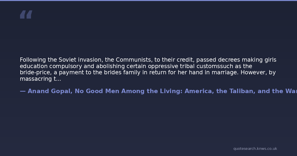 Following the Soviet invasion, the Communists, to their credit, passed decrees making girls education compulsory and abolishing certain oppressive tribal customssuch as the bride-price, a payment to the brides family in return for her hand in marriage. However, by massacring thousands of tribal elders, they paved the way for the commanders to step in as the new elite. Aided by American and Saudi patronage, extremism flourished. What had once been a social practice confined to areas deep in the hinterlands now became a political practice, which, according to ideologues, applied to the entire country. The modest gains of urban women were erased.The first time a woman enters her husbands house," Heela told me about life in the countryside, she wears whiteher wedding dressand the first time she leaves, she wears whitethe color of the Muslim funeral shroud. The rules of this arrangement were intricate and precise, and, it seemed to Heela, unchanged from time immemorial. In Uruzgan, a woman did not step outside her compound. In an emergency, she required the company of a male blood relative to leave, and then only with her fathers or husbands permission. Even the sound of her voice carried a hint of subversion, so she was kept out of hearing range of unrelated males. When the man of the house was not present, boys were dispatched to greet visitors. Unrelated males also did not inquire directly about a female member of the house. Asking How is your wife? qualified as somewhere between uncomfortably impolite and downright boorish. The markers of a womans lifebirths, anniversaries, funerals, prayers, feastsexisted entirely within the four walls of her home. Gossip, hopscotching from living room to living room, was carried by husbands or sons.