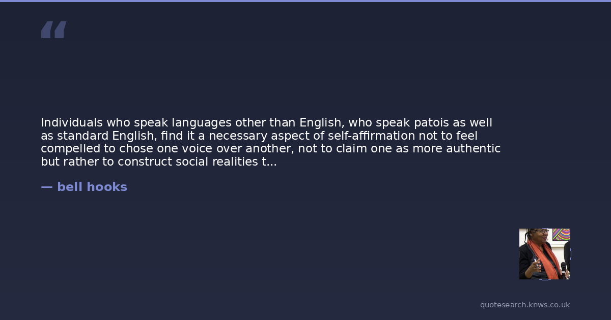 Individuals who speak languages other than English, who speak patois as well as standard English, find it a necessary aspect of self-affirmation not to feel compelled to chose one voice over another, not to claim one as more authentic but rather to construct social realities that celebrate, acknowledge and affirm differences, variety.