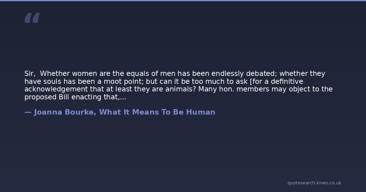 Sir, Whether women are the equals of men has been endlessly debated; whether they have souls has been a moot point; but can it be too much to ask [for a definitive acknowledgement that at least they are animals? Many hon. members may object to the proposed Bill enacting that, in statutes respecting the suffrage, 'wherever words occur which import the masculine gender they shall be held to include women;' but could any object to the insertion of a clause in another Act that 'whenever the word "animal" occur it shall be held to include women?' Suffer me, thorough your columns, to appeal to our 650 [parliamentary] representatives, and ask Is there not one among you then who will introduce such a motion? There would then be at least an equal interdict on wanton barbarity to cat, dog, or woman Yours respectfully, AN EARNEST ENGLISHWOMAN