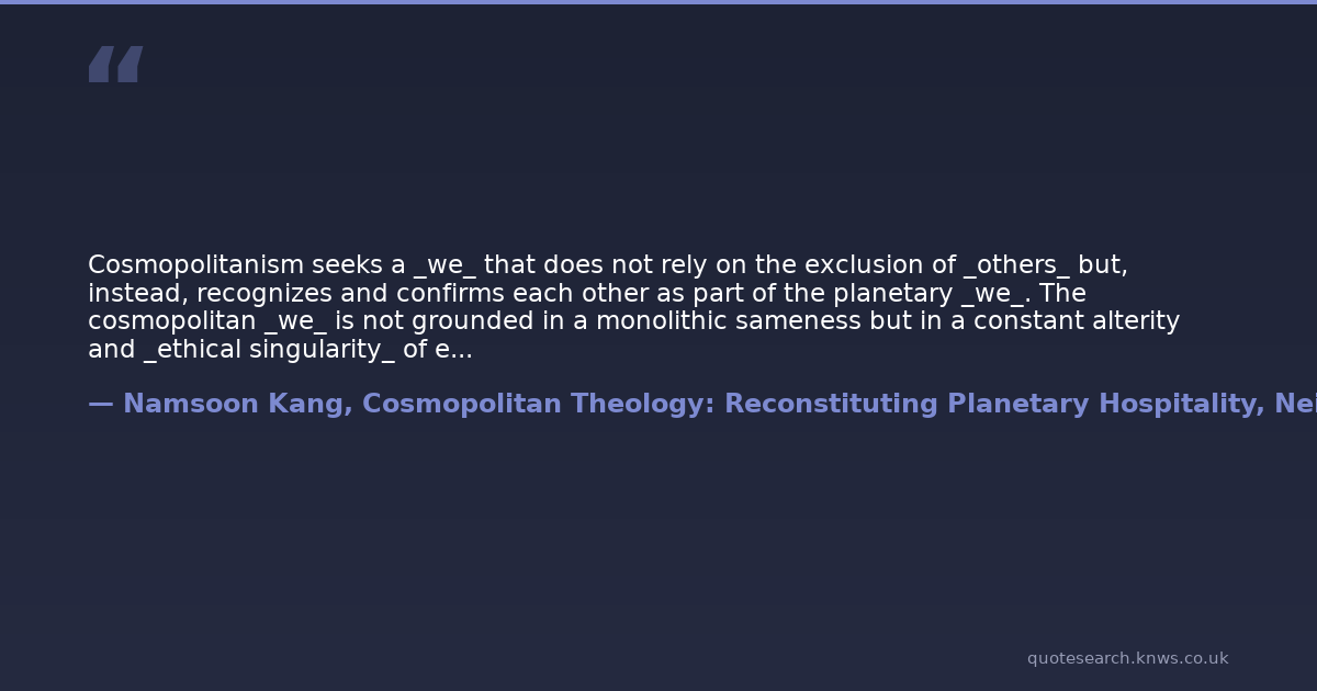 Cosmopolitanism seeks a _we_ that does not rely on the exclusion of _others_ but, instead, recognizes and confirms each other as part of the planetary _we_. The cosmopolitan _we_ is not grounded in a monolithic sameness but in a constant alterity and _ethical singularity_ of each individual human person regardless of one's national origin and belonging, religious affiliation, gender, race and ethnicity, class ability, or sexuality.