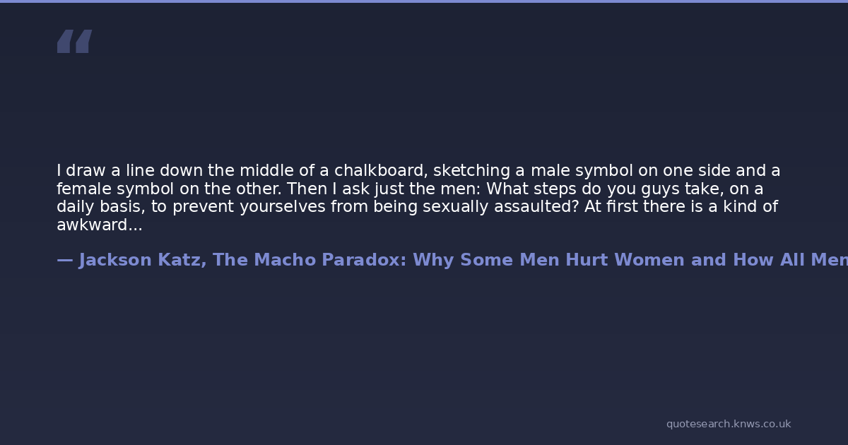 I draw a line down the middle of a chalkboard, sketching a male symbol on one side and a female symbol on the other. Then I ask just the men: What steps do you guys take, on a daily basis, to prevent yourselves from being sexually assaulted? At first there is a kind of awkward silence as the men try to figure out if they've been asked a trick question. The silence gives way to a smattering of nervous laughter. Occasionally, a young a guy will raise his hand and say, 'I stay out of prison.' This is typically followed by another moment of laughter, before someone finally raises his hand and soberly states, 'Nothing. I don't think about it.' Then I ask women the same question. What steps do you take on a daily basis to prevent yourselves from being sexually assaulted? Women throughout the audience immediately start raising their hands. As the men sit in stunned silence, the women recount safety precautions they take as part of their daily routine. Here are some of their answers: Hold my keys as a potential weapon. Look in the back seat of the car before getting in. Carry a cell phone. Don't go jogging at night. Lock all the windows when I sleep, even on hot summer nights. Be careful not to drink too much. Don't put my drink down and come back to it; make sure I see it being poured. Own a big dog. Carry Mace or pepper spray. Have an unlisted phone number. Have a man's voice on my answering machine. Park in well-lit areas. Don't use parking garages. Don't get on elevators with only one man, or with a group of men. Vary my route home from work. Watch what I wear. Don't use highway rest areas. Use a home alarm system. Don't wear headphones when jogging. Avoid forests or wooded areas, even in the daytime. Don't take a first-floor apartment. Go out in groups. Own a firearm. Meet men on first dates in public places. Make sure to have a car or cab fare. Don't make eye contact with men on the street. Make assertive eye contact with men on the street.
