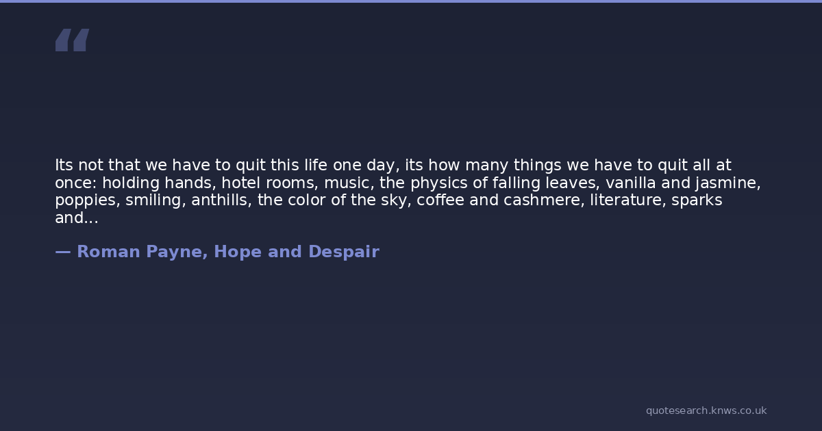 Its not that we have to quit this life one day, its how many things we have to quit all at once: holding hands, hotel rooms, music, the physics of falling leaves, vanilla and jasmine, poppies, smiling, anthills, the color of the sky, coffee and cashmere, literature, sparks and subway trains... If only one could leave this life slowly!