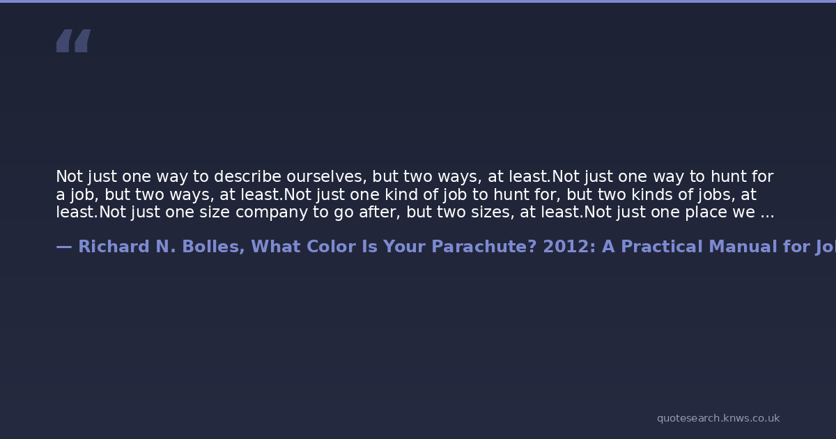 Not just one way to describe ourselves, but two ways, at least.Not just one way to hunt for a job, but two ways, at least.Not just one kind of job to hunt for, but two kinds of jobs, at least.Not just one size company to go after, but two sizes, at least.Not just one place we really would like to work at, but two places, at least.