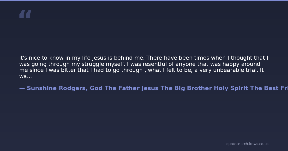 It's nice to know in my life Jesus is behind me. There have been times when I thought that I was going through my struggle myself. I was resentful of anyone that was happy around me since I was bitter that I had to go through , what I felt to be, a very unbearable trial. It was a good relief to know that I could talk to Jesus about my problems when I felt like I had no one else to talk to. It was comforting to know that He understood my dilemma when others couldn't.