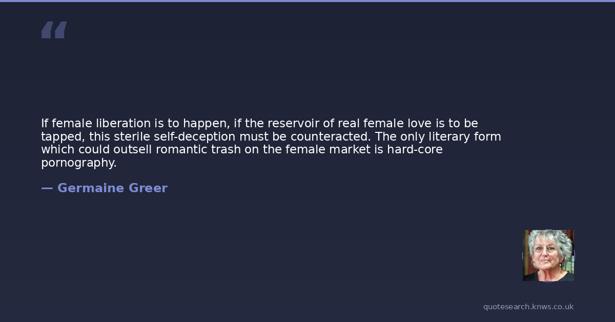 If female liberation is to happen, if the reservoir of real female love is to be tapped, this sterile self-deception must be counteracted. The only literary form which could outsell romantic trash on the female market is hard-core pornography.
