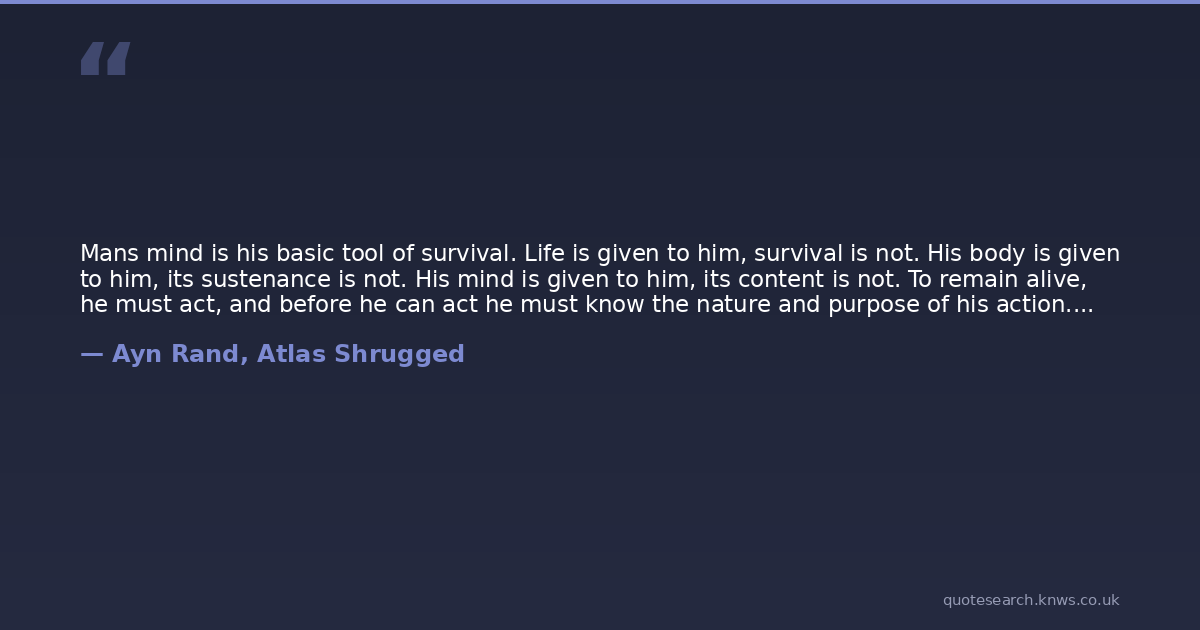 Mans mind is his basic tool of survival. Life is given to him, survival is not. His body is given to him, its sustenance is not. His mind is given to him, its content is not. To remain alive, he must act, and before he can act he must know the nature and purpose of his action...To remain alive, he must think.