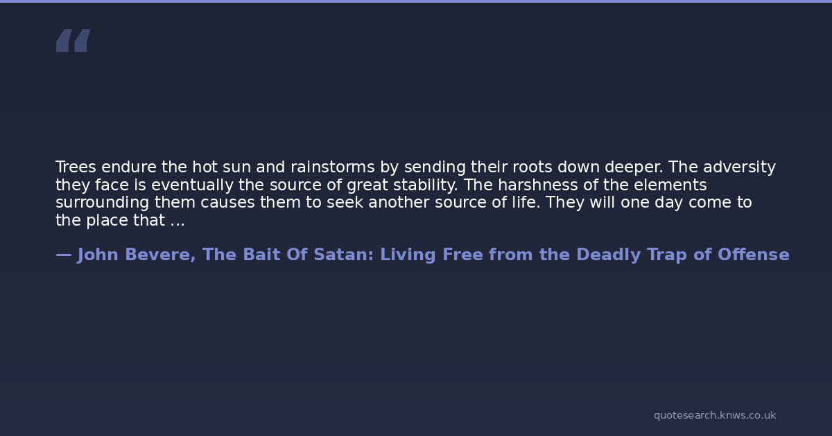 Trees endure the hot sun and rainstorms by sending their roots down deeper. The adversity they face is eventually the source of great stability. The harshness of the elements surrounding them causes them to seek another source of life. They will one day come to the place that even the greatest of windstorms cannot affect their ability to produce fruit.