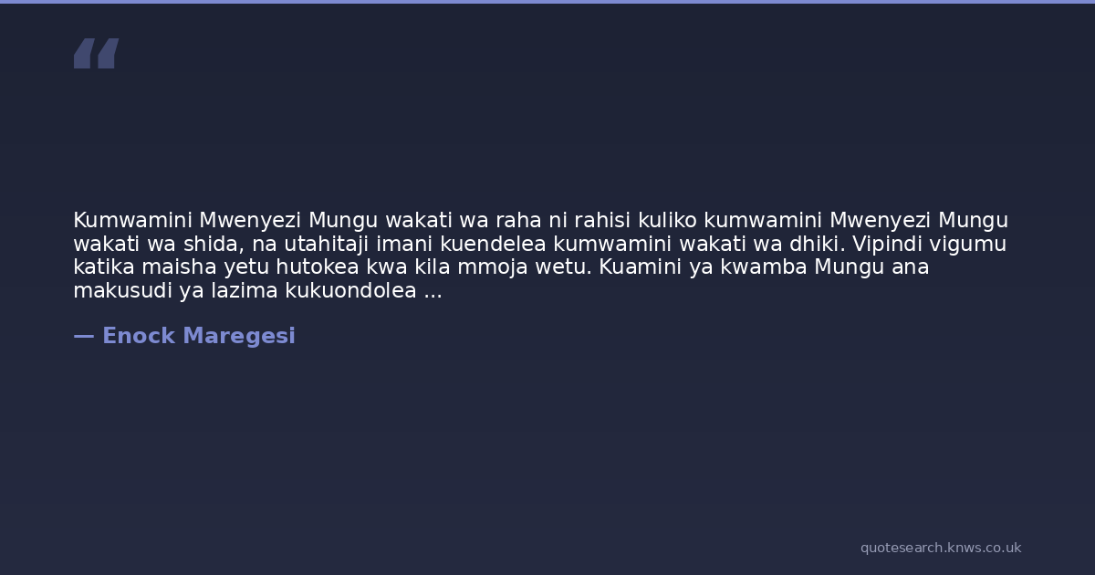Kumwamini Mwenyezi Mungu wakati wa raha ni rahisi kuliko kumwamini Mwenyezi Mungu wakati wa shida, na utahitaji imani kuendelea kumwamini wakati wa dhiki. Vipindi vigumu katika maisha yetu hutokea kwa kila mmoja wetu. Kuamini ya kwamba Mungu ana makusudi ya lazima kukuondolea vikwazo katika maisha yako ni vigumu sana wakati mwingine, lakini imani ndicho kitu cha muhimu zaidi unachotakiwa kuwa nacho katika kipindi hiki ambacho dunia imekata tamaa. Amani ya Mungu, ambayo huzidi hekima na maarifa yote ya kibinadamu, ni kuliamini neno la Mungu kwamba ni la kweli. Bila imani hutaweza kumfurahisha Mungu. Imani ni ufunguo wa nguvu, uwezo na neema ambavyo Mungu ametupangia. Kwa ufupi, Mungu ni mkubwa kuliko wewe na matatizo yako.
