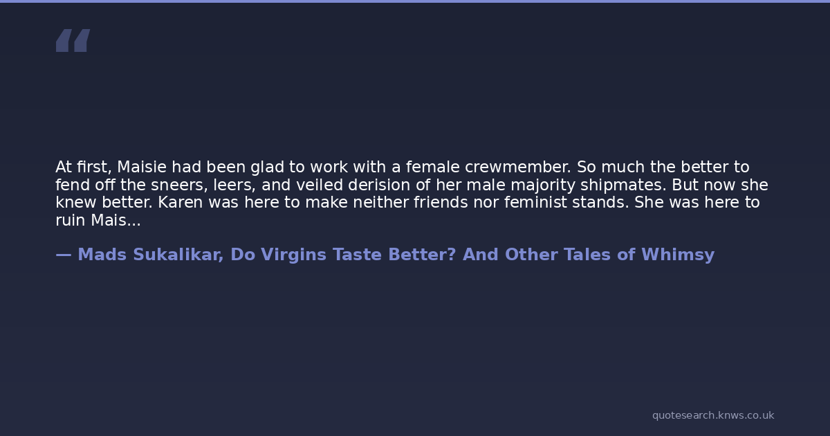 At first, Maisie had been glad to work with a female crewmember. So much the better to fend off the sneers, leers, and veiled derision of her male majority shipmates. But now she knew better. Karen was here to make neither friends nor feminist stands. She was here to ruin Maisies career!