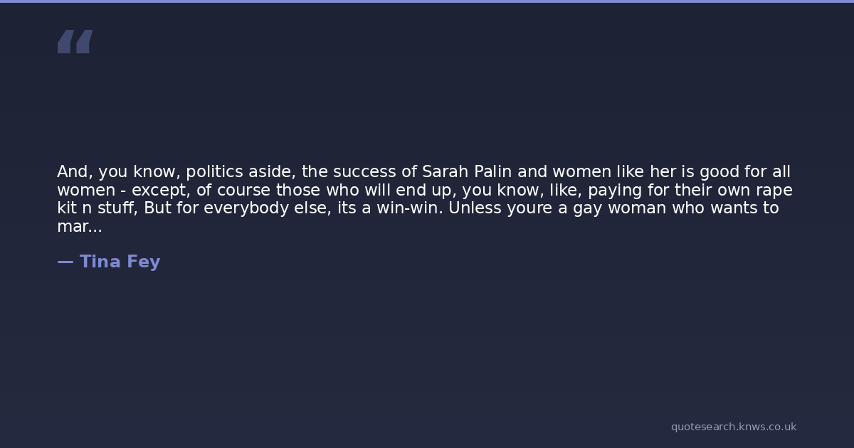 And, you know, politics aside, the success of Sarah Palin and women like her is good for all women - except, of course those who will end up, you know, like, paying for their own rape kit n stuff, But for everybody else, its a win-win. Unless youre a gay woman who wants to marry your partner of 20 years - whatever. But for most women, the success of conservative women is good for all of us. Unless you believe in evolution. You know - actually, I take it back. The whole things a disaster.