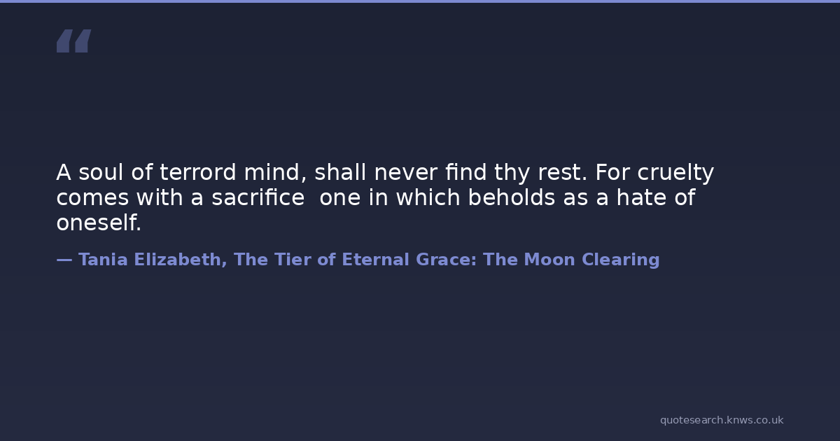 A soul of terrord mind, shall never find thy rest. For cruelty comes with a sacrifice one in which beholds as a hate of oneself.