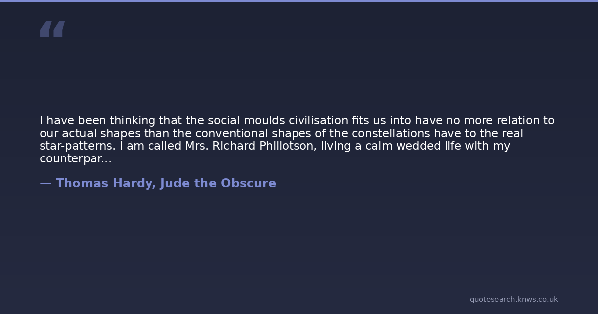 I have been thinking that the social moulds civilisation fits us into have no more relation to our actual shapes than the conventional shapes of the constellations have to the real star-patterns. I am called Mrs. Richard Phillotson, living a calm wedded life with my counterpart of that name. But I am not really Mrs. Richard Phillotson, but a woman tossed about, all alone, with aberrant passions, and unaccountable antipathies....