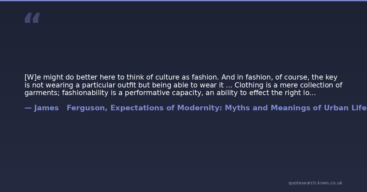 [W]e might do better here to think of culture as fashion. And in fashion, of course, the key is not wearing a particular outfit but being able to wear it ... Clothing is a mere collection of garments; fashionability is a performative capacity, an ability to effect the right look through an effective combination of garments, social sense, and bodily performance.