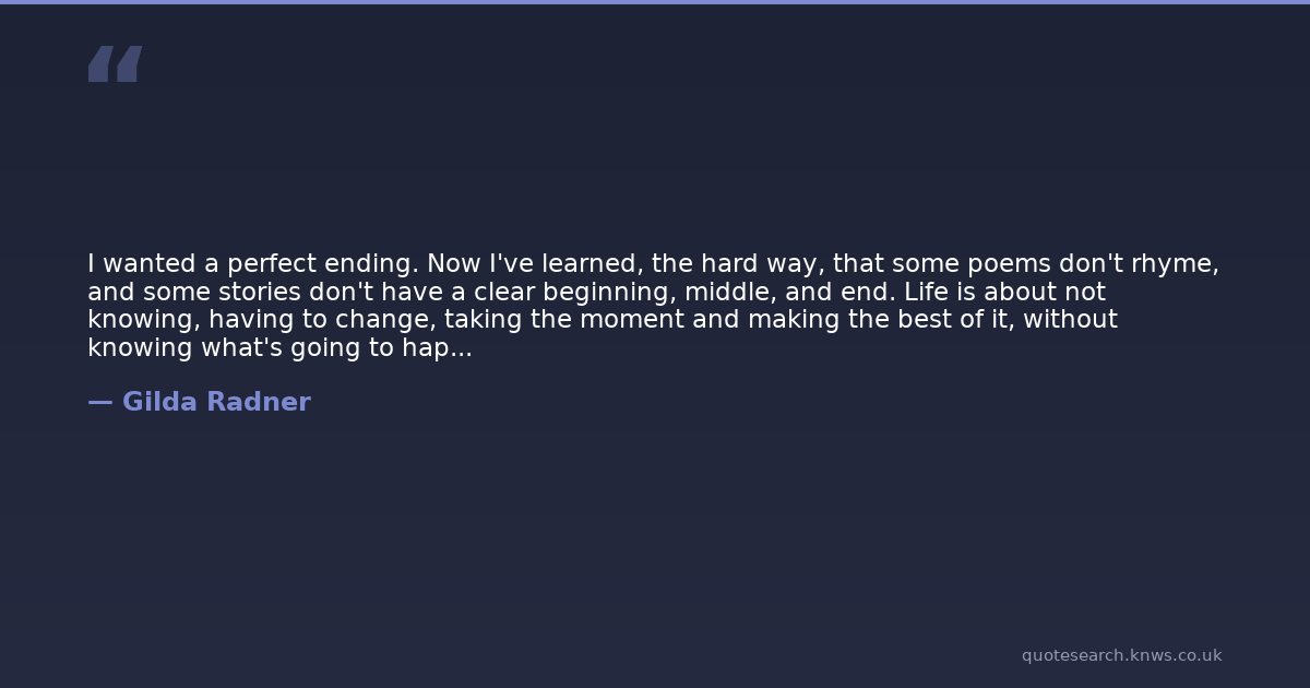 I wanted a perfect ending. Now I've learned, the hard way, that some poems don't rhyme, and some stories don't have a clear beginning, middle, and end. Life is about not knowing, having to change, taking the moment and making the best of it, without knowing what's going to happen next.Delicious Ambiguity.