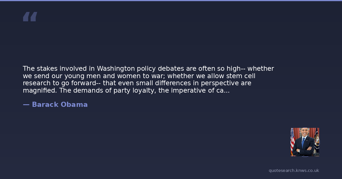 The stakes involved in Washington policy debates are often so high-- whether we send our young men and women to war; whether we allow stem cell research to go forward-- that even small differences in perspective are magnified. The demands of party loyalty, the imperative of campaigns, and the amplification of conflict by the media all contribute to an atmosphere of suspicion. Moreover, most people who serve in Washington have been trained either as lawyers or as political operatives-- professions that tend to place a premium on winning arguments rather than solving problems. I can see how, after a certain amount of time in the capital, it becomes tempting to assume that those who disagree with you have fundamentally different values-- indeed, that they are motivated by bad faith, and perhaps are bad people.