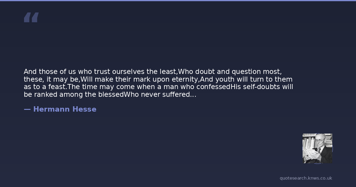 And those of us who trust ourselves the least,Who doubt and question most, these, it may be,Will make their mark upon eternity,And youth will turn to them as to a feast.The time may come when a man who confessedHis self-doubts will be ranked among the blessedWho never suffered anguish or knew fear,Whose times were times of glory and good cheer,Who lived like children, simple happy lives.For in us too is part of that Eternal MindWhich through the aeons calls to brothers of its kind:Both you and I will pass, but it survives.