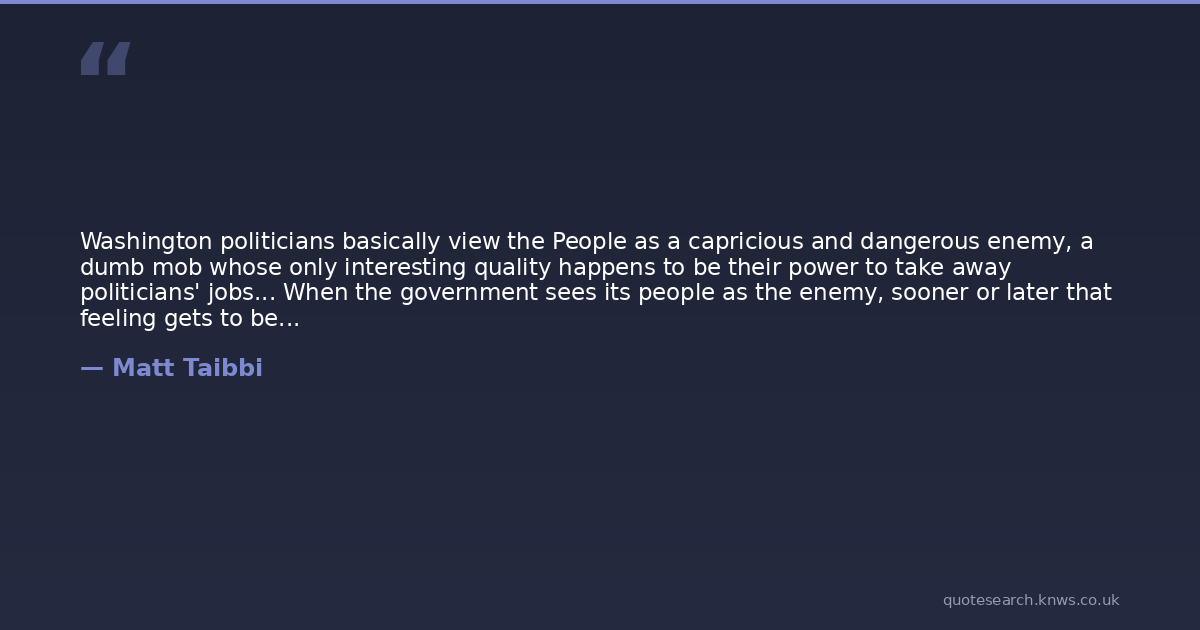 Washington politicians basically view the People as a capricious and dangerous enemy, a dumb mob whose only interesting quality happens to be their power to take away politicians' jobs... When the government sees its people as the enemy, sooner or later that feeling gets to be mutual. And that's when the real weirdness begins.