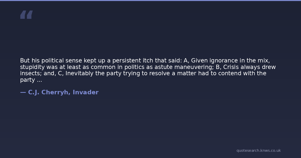 But his political sense kept up a persistent itch that said: A, Given ignorance in the mix, stupidity was at least as common in politics as astute maneuvering; B, Crisis always drew insects; and, C, Inevitably the party trying to resolve a matter had to contend with the party most willing to exploit it.
