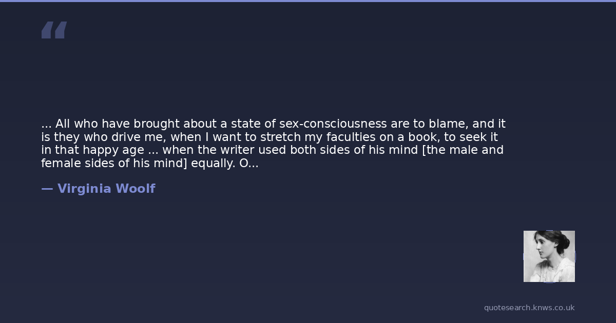 ... All who have brought about a state of sex-consciousness are to blame, and it is they who drive me, when I want to stretch my faculties on a book, to seek it in that happy age ... when the writer used both sides of his mind [the male and female sides of his mind] equally. One must turn back to Shakespeare then, for Shakespeare was androgynous; and so were Keats and Sterne and Cowper and Lamb and Coleridge. Shelley perhaps was sexless. Milton and Ben Jonson had a dash too much of the male in them. So had Wordsworth and Tolstoy.