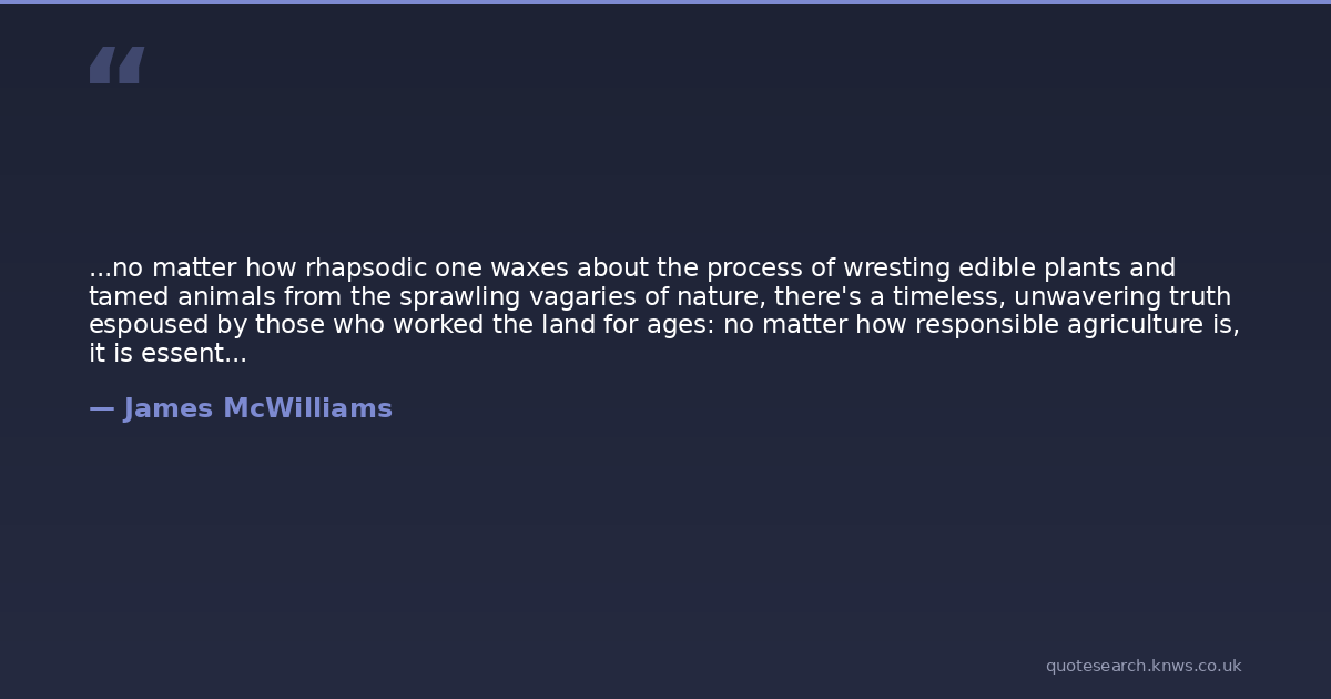 ...no matter how rhapsodic one waxes about the process of wresting edible plants and tamed animals from the sprawling vagaries of nature, there's a timeless, unwavering truth espoused by those who worked the land for ages: no matter how responsible agriculture is, it is essentially about achieving the lesser of evils. To work the land is to change the land, to shape it to benefit one species over another, and thus necessarily to tame what is wild. Our task should be to deliver our blows gently.