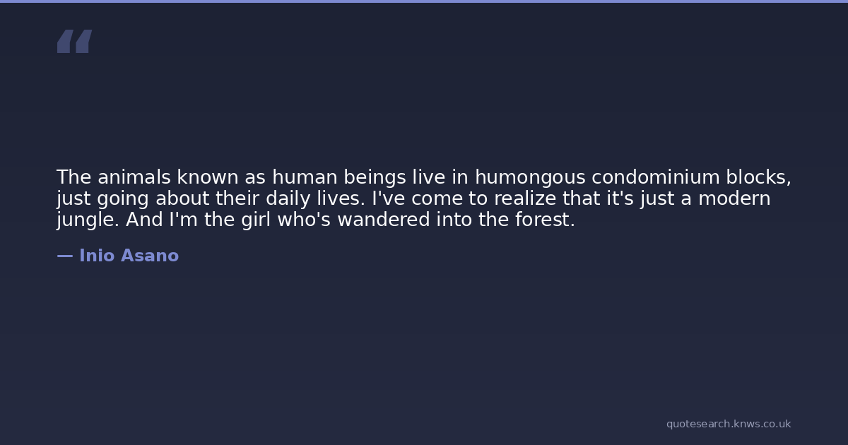 The animals known as human beings live in humongous condominium blocks, just going about their daily lives. I've come to realize that it's just a modern jungle. And I'm the girl who's wandered into the forest.