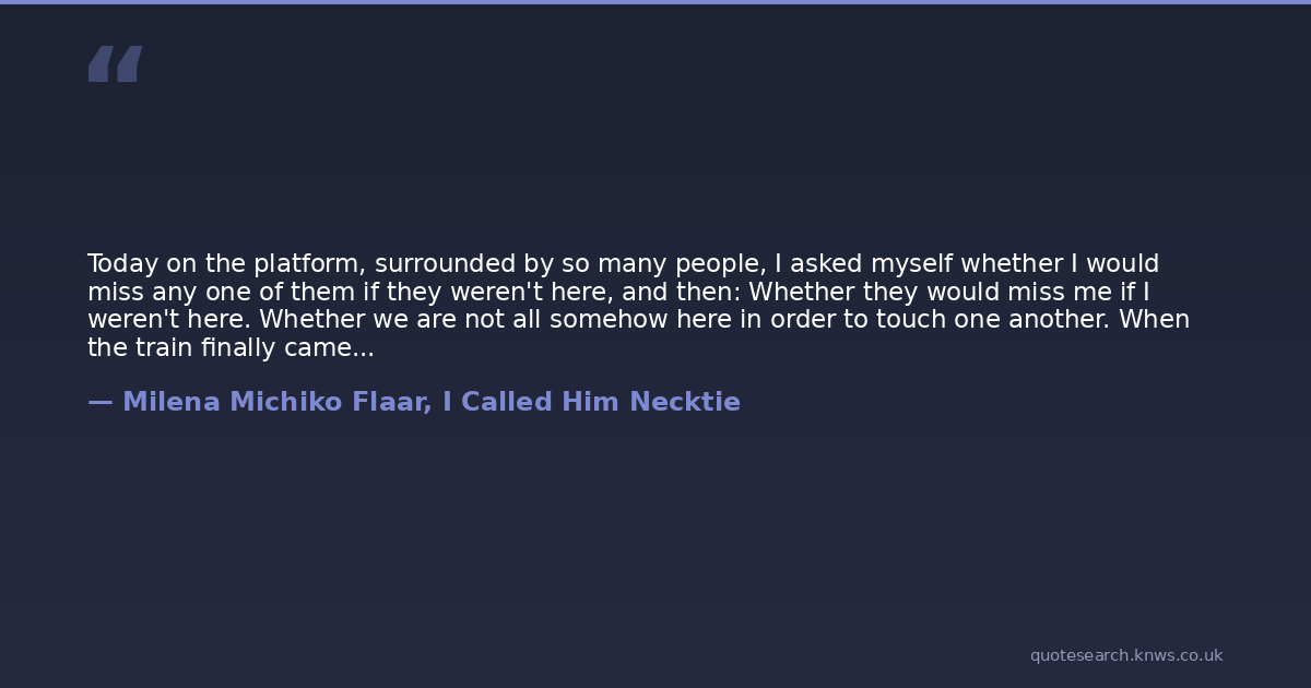 Today on the platform, surrounded by so many people, I asked myself whether I would miss any one of them if they weren't here, and then: Whether they would miss me if I weren't here. Whether we are not all somehow here in order to touch one another. When the train finally came and I saw my reflection in its windows and in the sleeping faces rolling by behind them, there was no question, only an insight: We must all, every one of us, relate to one another.