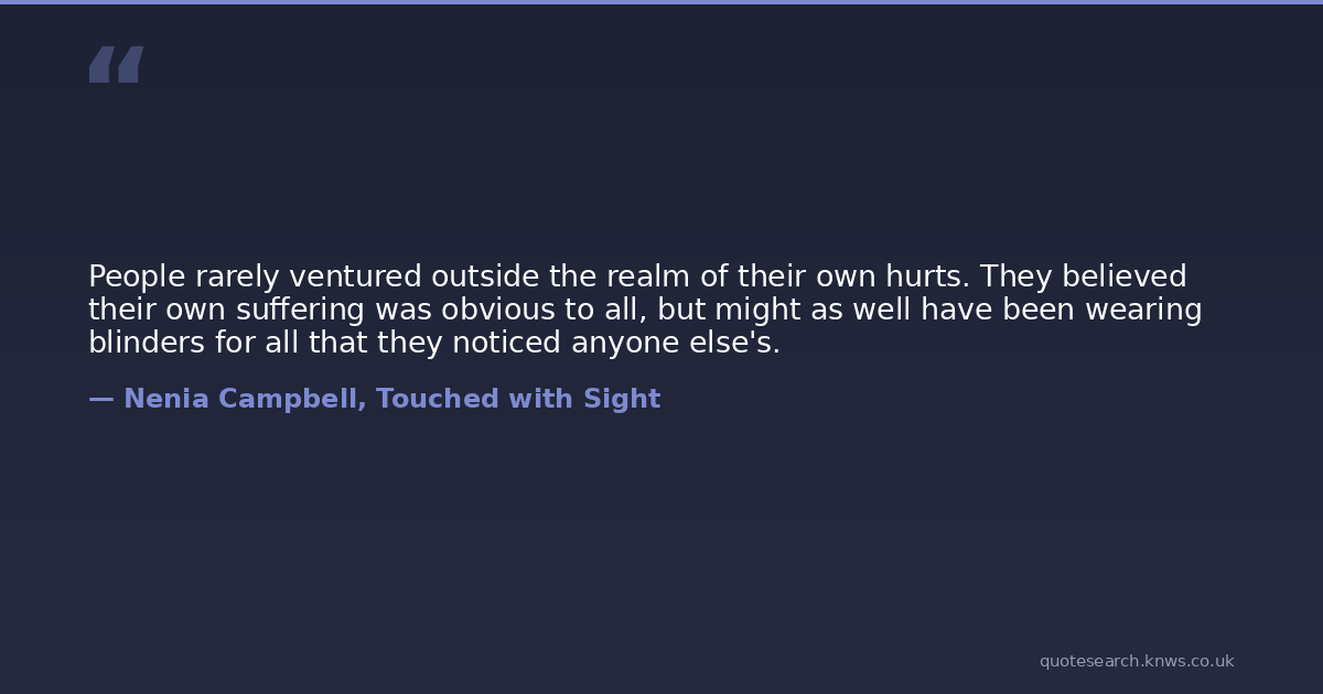 People rarely ventured outside the realm of their own hurts. They believed their own suffering was obvious to all, but might as well have been wearing blinders for all that they noticed anyone else's.