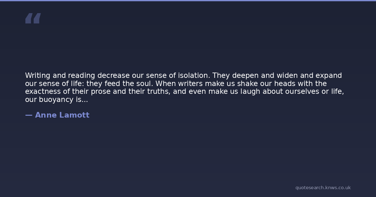 Writing and reading decrease our sense of isolation. They deepen and widen and expand our sense of life: they feed the soul. When writers make us shake our heads with the exactness of their prose and their truths, and even make us laugh about ourselves or life, our buoyancy is restored. We are given a shot at dancing with, or at least clapping along with, the absurdity of life, instead of being squashed by it over and over again. It's like singing on a boat during a terrible storm at sea. You can't stop the raging storm, but singing can change the hearts and spirits of the people who are together on that ship.