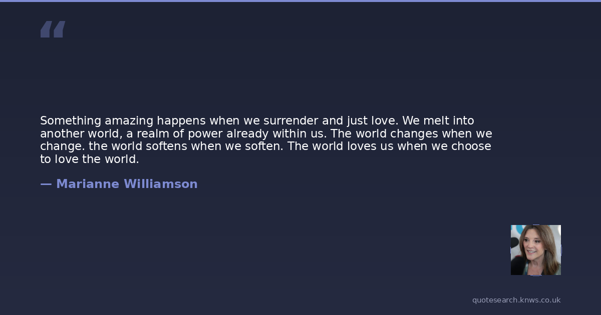 Something amazing happens when we surrender and just love. We melt into another world, a realm of power already within us. The world changes when we change. the world softens when we soften. The world loves us when we choose to love the world.