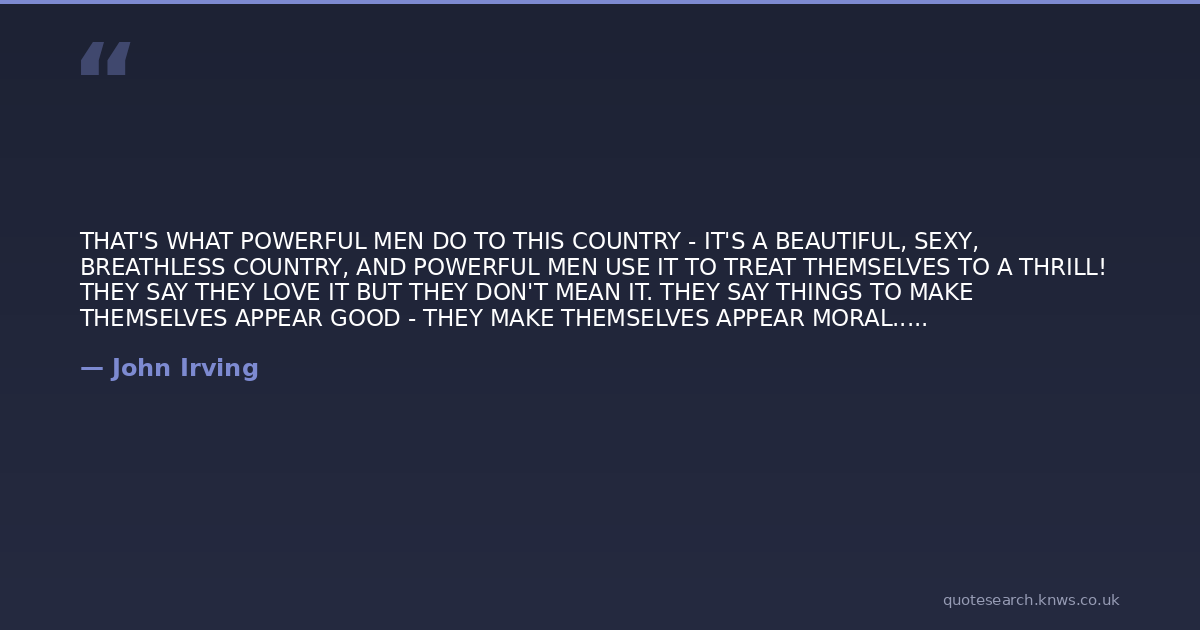 THAT'S WHAT POWERFUL MEN DO TO THIS COUNTRY - IT'S A BEAUTIFUL, SEXY, BREATHLESS COUNTRY, AND POWERFUL MEN USE IT TO TREAT THEMSELVES TO A THRILL! THEY SAY THEY LOVE IT BUT THEY DON'T MEAN IT. THEY SAY THINGS TO MAKE THEMSELVES APPEAR GOOD - THEY MAKE THEMSELVES APPEAR MORAL...THE COUNTRY WANTS A SAVIOUR. THE COUNTRY IS A SUCKER FOR POWERFUL MEN WHO LOOK GOOD. WE THINK THEY'RE MORALISTS AND THEN THEY JUST USE US.