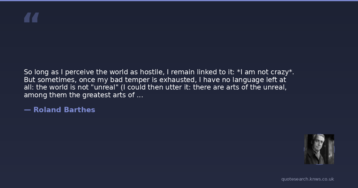 So long as I perceive the world as hostile, I remain linked to it: *I am not crazy*. But sometimes, once my bad temper is exhausted, I have no language left at all: the world is not "unreal" (I could then utter it: there are arts of the unreal, among them the greatest arts of all), but disreal: reality has fled from it, is nowhere, so that I no longer have any meaning (any paradigm) available to me; *I do not manage* to define my relations with Coluche, the restaurant, the painter, the Piazza del Popolo. What relation can I have with a system of power if I am neither its slave nor its accomplice nor its witness." from_A Lover's Discourse: Fragments_