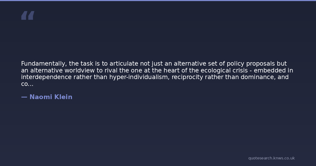 Fundamentally, the task is to articulate not just an alternative set of policy proposals but an alternative worldview to rival the one at the heart of the ecological crisis - embedded in interdependence rather than hyper-individualism, reciprocity rather than dominance, and cooperation rather than hierarchy. This is required not only to create a political context to dramatically lower emissions, but also to help us cope with the disasters we can no longer avoid. Because in the hot and stormy future we have already made inevitable through our past emissions, an unshakable belief in the equal rights of all people and a capacity for deep compassion will be the only things standing between civilization and barbarism.