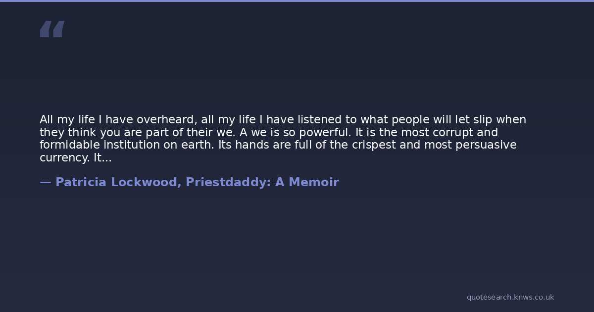 All my life I have overheard, all my life I have listened to what people will let slip when they think you are part of their we. A we is so powerful. It is the most corrupt and formidable institution on earth. Its hands are full of the crispest and most persuasive currency. Its mouth is full of received, repeating language. The we closes its ranks to protect the space inside it, where the air is different. It does not protect people. It protects its own shape.