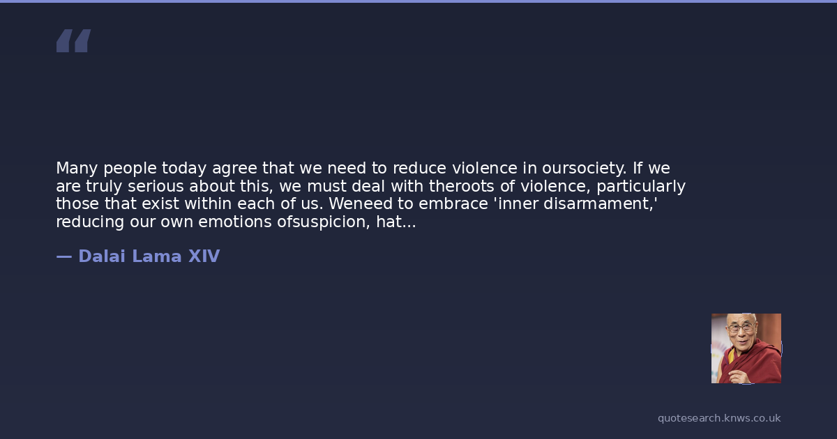 Many people today agree that we need to reduce violence in oursociety. If we are truly serious about this, we must deal with theroots of violence, particularly those that exist within each of us. Weneed to embrace 'inner disarmament,' reducing our own emotions ofsuspicion, hatred and hostility toward our brothers and sisters.