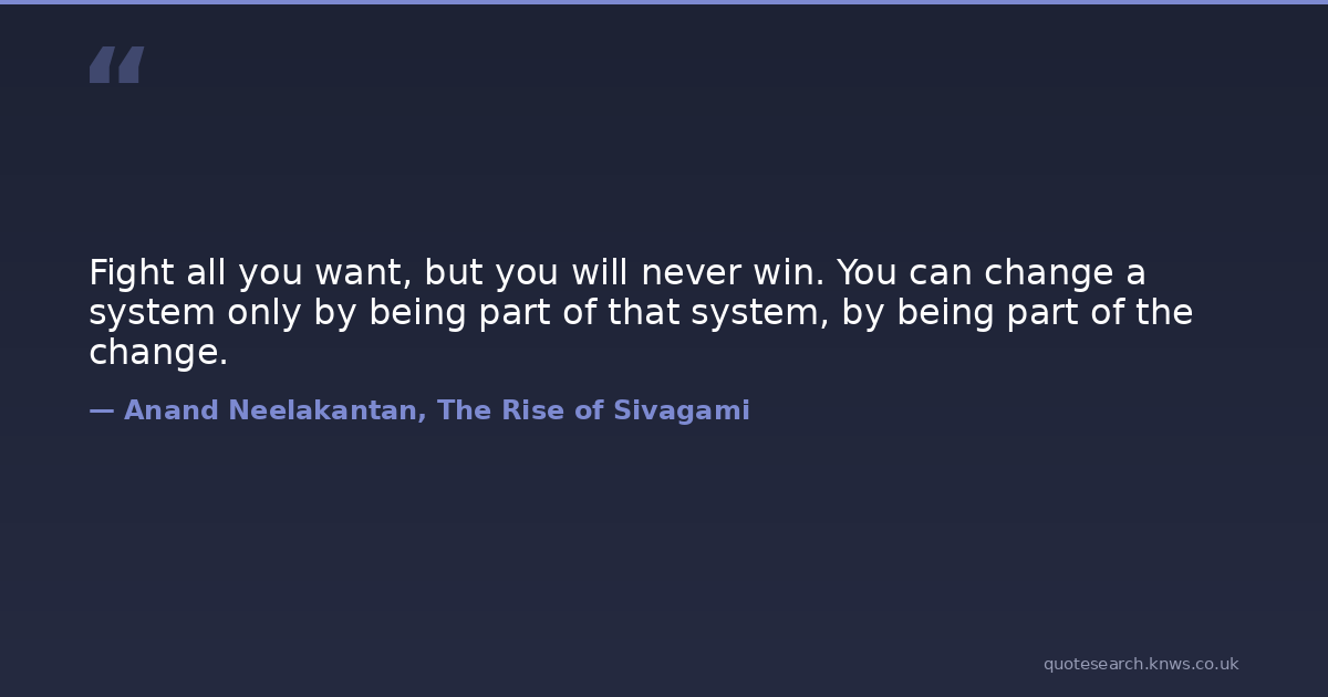 Fight all you want, but you will never win. You can change a system only by being part of that system, by being part of the change.