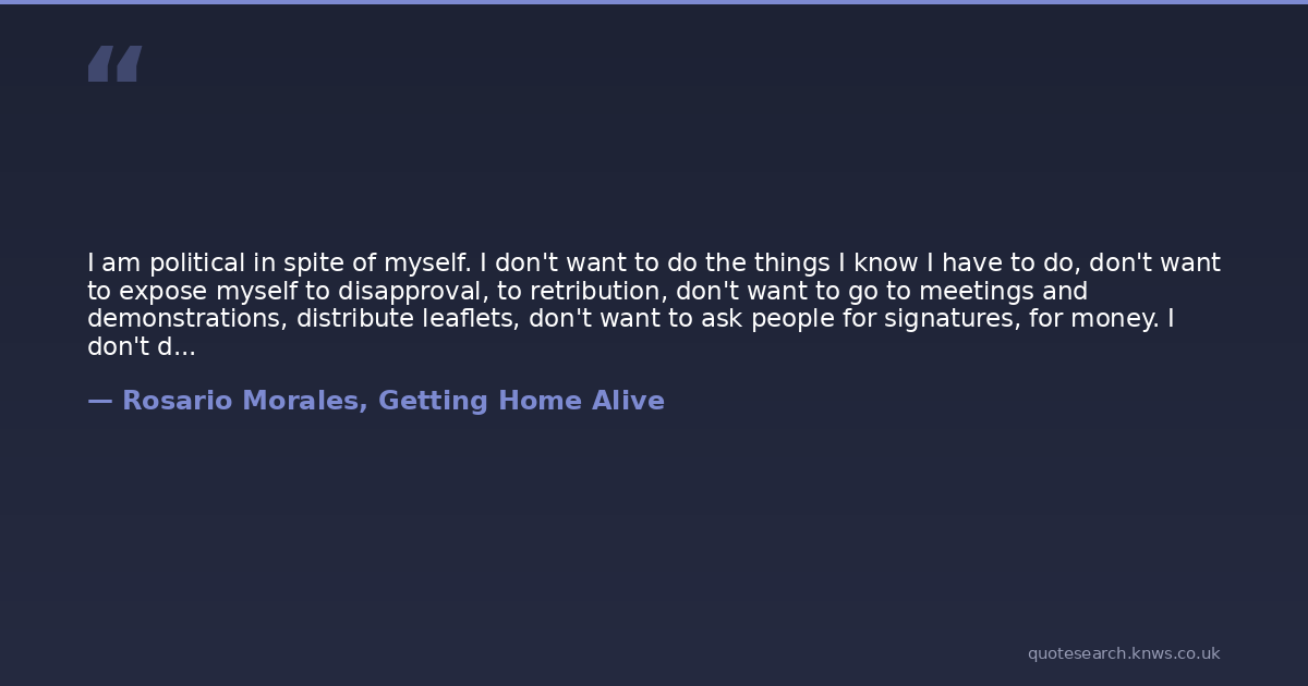 I am political in spite of myself. I don't want to do the things I know I have to do, don't want to expose myself to disapproval, to retribution, don't want to go to meetings and demonstrations, distribute leaflets, don't want to ask people for signatures, for money. I don't do these things as naturally as I breathe, the way I imagine real political people do, real communists, real socialists and feminists, real radicals, real troublemakers, real champions of the people. I do them because I know I've got to, because I am convinced it's the only way to make changes, to stop abuses. I do them almost as a last resort. I do them because I've been putting off doing them, avoiding them for months, because finally the necessity has gripped me and overcome my reluctance, my desire for the warmth of my room, for my books, for my people, for the reassurance of my homely habits.