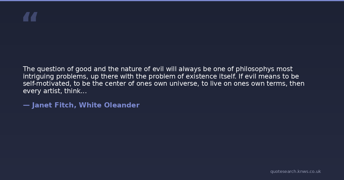 The question of good and the nature of evil will always be one of philosophys most intriguing problems, up there with the problem of existence itself. If evil means to be self-motivated, to be the center of ones own universe, to live on ones own terms, then every artist, thinker, every original mind, is evil. Because we dare to look through our own eyes rather than mouth clichs lent us from the so-called Fathers. To dare to see is to steal fire from the Gods. This is mankinds destiny, the engine which fuels us as a race.