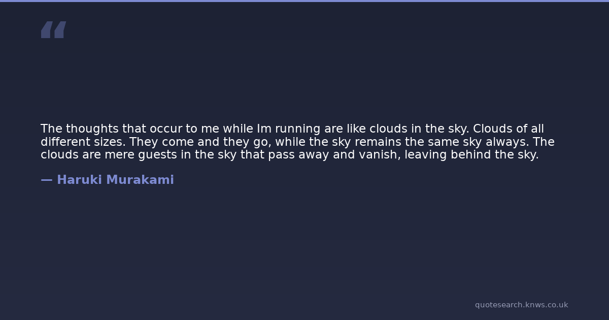 The thoughts that occur to me while Im running are like clouds in the sky. Clouds of all different sizes. They come and they go, while the sky remains the same sky always. The clouds are mere guests in the sky that pass away and vanish, leaving behind the sky.