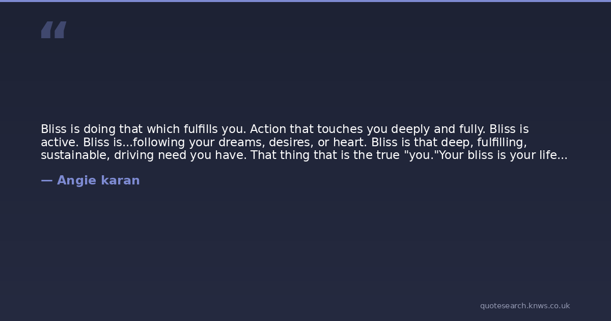 Bliss is doing that which fulfills you. Action that touches you deeply and fully. Bliss is active. Bliss is...following your dreams, desires, or heart. Bliss is that deep, fulfilling, sustainable, driving need you have. That thing that is the true "you."Your bliss is your life's purpose. Your bliss gives your otherwise meaningless life meaning. When you are following your bliss you are powerful and empowered. You are focused and the universe is waiting to help you.