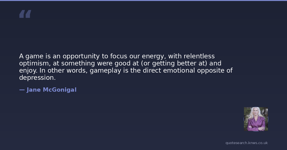 A game is an opportunity to focus our energy, with relentless optimism, at something were good at (or getting better at) and enjoy. In other words, gameplay is the direct emotional opposite of depression.