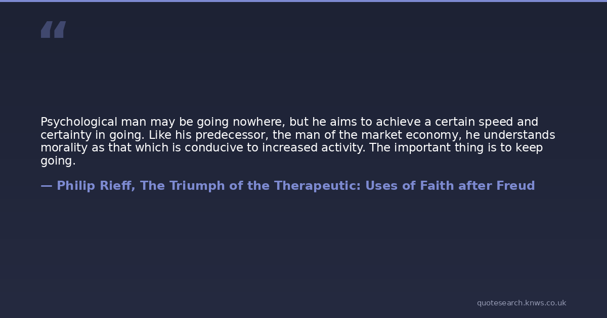 Psychological man may be going nowhere, but he aims to achieve a certain speed and certainty in going. Like his predecessor, the man of the market economy, he understands morality as that which is conducive to increased activity. The important thing is to keep going.