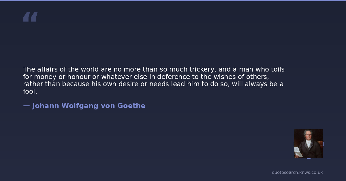 The affairs of the world are no more than so much trickery, and a man who toils for money or honour or whatever else in deference to the wishes of others, rather than because his own desire or needs lead him to do so, will always be a fool.